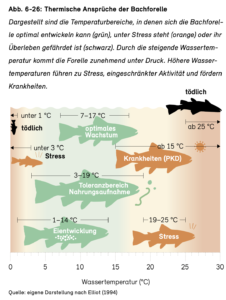 Die bisherige Erwärmung hat nachweislich bereits zu einem Rückzug der Bachforellen um 100 – 200 Höhenmeter geführt und die Ausbreitung von Fischkrankheiten wie der proliferativen Nierenkrankheit PKD begünstigt 2. Wenn allerdings die Gewässer komplett austrocknen oder der Sauerstoffgehalt zu stark sinkt, ist dies eine Bedrohung für alle Fischarten und ihre Nahrungsgrundlage, auch wenn sie mit der Temperatur selbst eigentlich noch zurechtkämen.