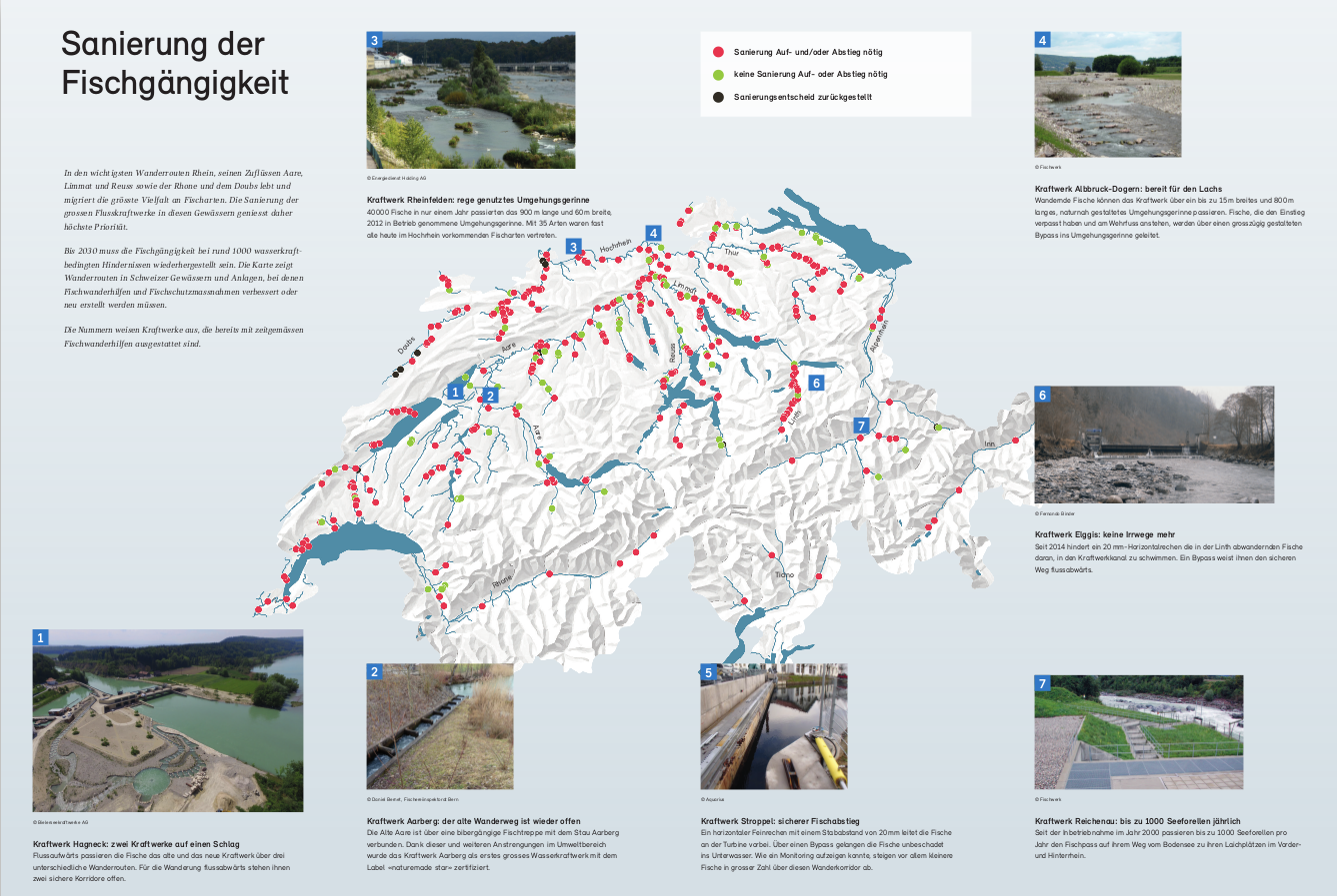 von den gesamtschweizerisch 2’075 kraftwerksbedingten Wanderhindernissen müssen bis im Jahr 2030 bei 970 der Fischaufstieg, der Fischabstieg oder beide Wanderkorridore wiederhergestellt werden. Im Detail bedeutet dies, dass